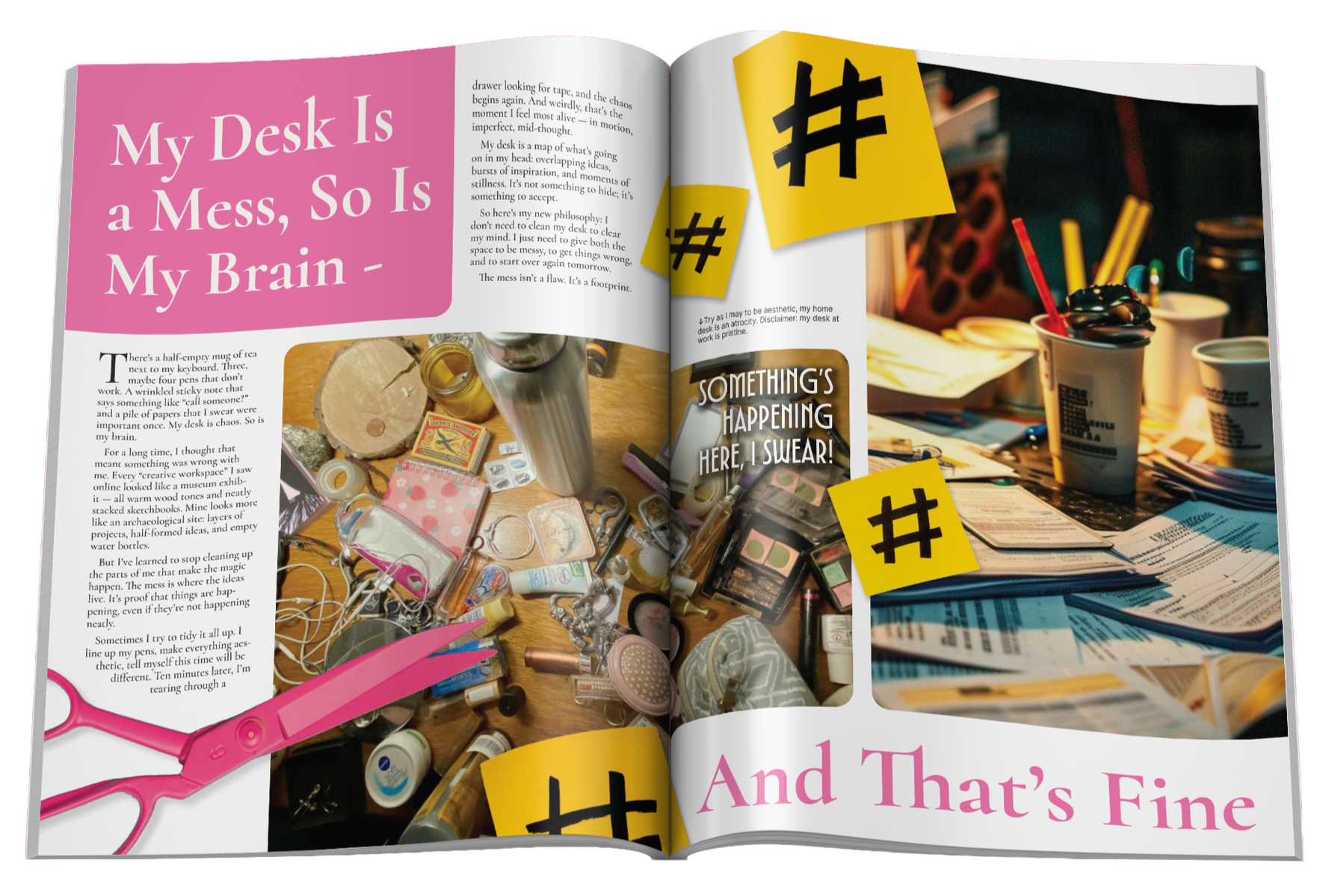 This spread turns everyday chaos into creative texture. Layered photos, sticky notes, and playful typography mirror the cluttered energy of a mind in motion. It embraces imperfection as a sign of life and a visual reminder that creativity isn’t clean or contained, it’s spontaneous and messy!