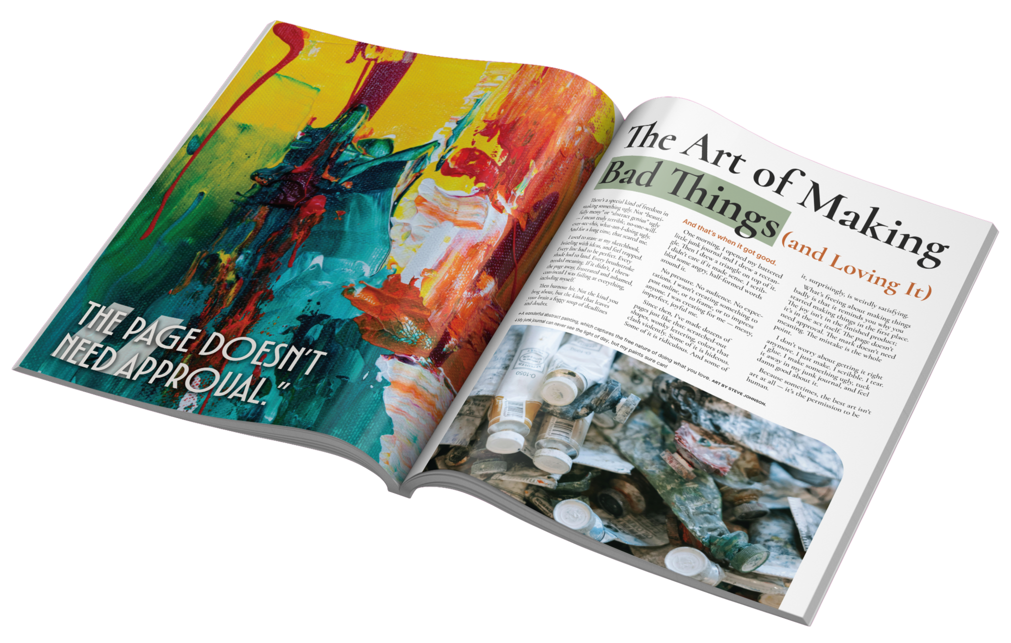 This spread celebrates the freedom of imperfection — the messy, colorful side of creativity that refuses to ask for approval. The left page explodes with paint and energy, while the right balances it with thoughtful typography and rhythm. Together, they tell a story about embracing mistakes, trusting process, and finding joy in what’s raw, human, and beautifully unfinished.